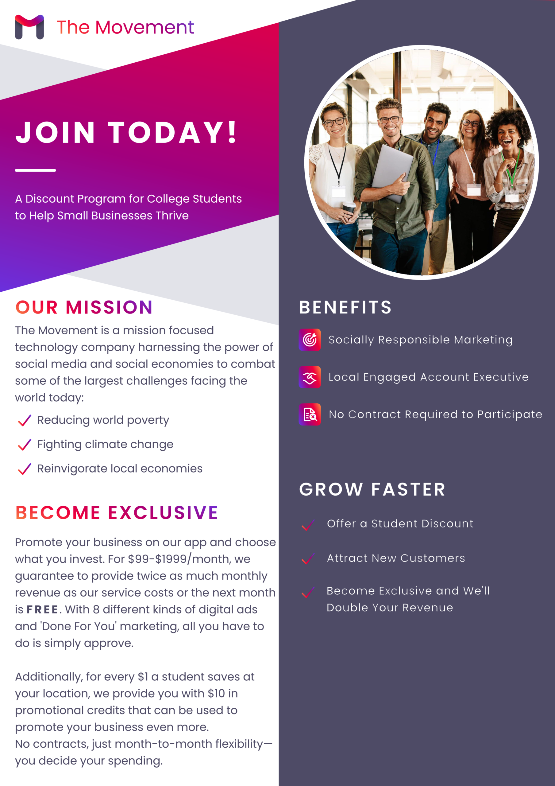 The Movement works with three business per category to secure exclusive visibility to student demand near campus.